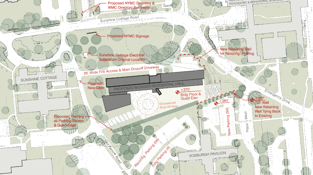 On the site of the existing Munger Building, New York Medical College (NYMC) is proposing the construction of a new 400-bed residence hall. The proposed building will be 11 floors and include approximately 235,000 gross square feet of space. There will be a mix of studio, one-bedroom, and two-bedroom units. The proposed building will also include a flexible multipurpose space with seating up to 400 to accommodate existing NYMC programs. The proposed project will also include ancillary site improvements including new and reconfigured parking areas, access drives, pedestrian walkways, outdoor gathering spaces, and landscaping.