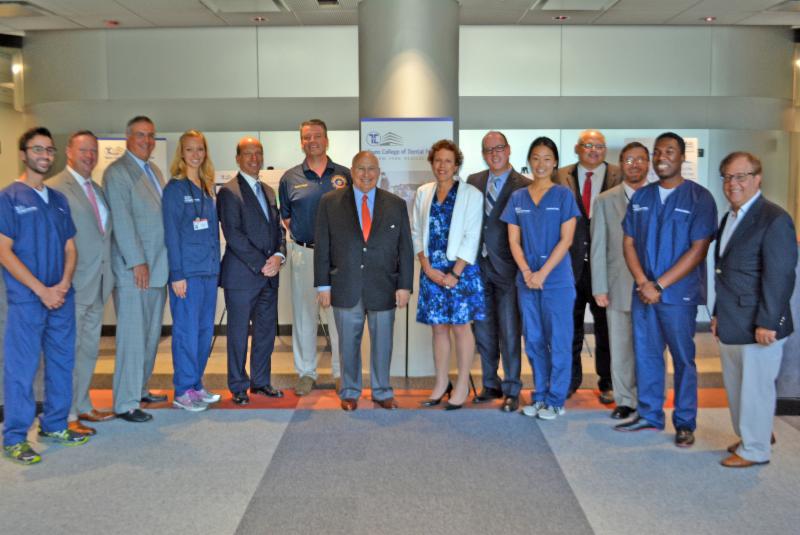 From left: Dental student George Rubin; William M. Mooney III, Director of the Westchester Office of Economic Development; John Ravitz, executive vice president and chief operating officer of the Business Council of Westchester; dental student Jennifer Mehrens; Ronnie Myers, D.D.S., TCDM senior associate dean for academic and administrative affairs; NYS Senator Terrence Murphy; Jay P. Goldsmith, D.M.D., TCDM founding dean; Amy Allen, vice president of the Westchester County Association; Laurence Gottlieb, president and chief executive officer of the Hudson Valley Economic Development Corporation; dental student Jessica Li; Edward F. Farkas, D.D.S., TCDM senior associate dean for clinical affairs and chairman of dentistry; Robert W. Amler, M.D., M.B.A., dean of the School of Health Sciences and Practice and vice president for government affairs; dental student Jaleel Bolden; and NYS Assemblyman Thomas J. Abinanti.